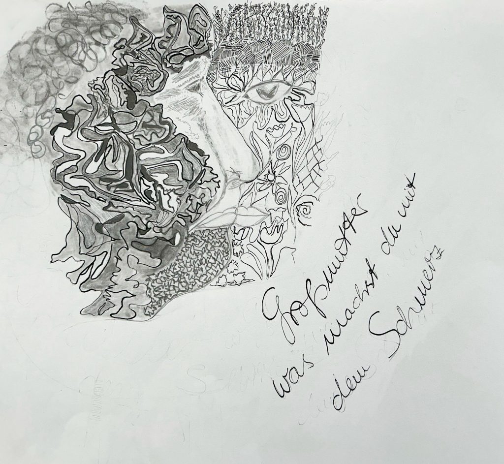 Die Zeichnung „Großmutter was machst du mit dem Schmerz“ wurde durch ein Foto angeregt, das eine junge Frau nahe am Gesicht einer alten Frau zeigt. Daraus hat die Künstlerin ein vielschichtiges Gesicht gestaltet mit fragmentierten Strukturen, was die tiefen Falten der Alten widerspiegeln soll. Es sind organische Linien, die sich absetzen von den floralen Strukturen im Gesicht der jungen Frau. Beide Figuren setzen sich aus geometrischen Mustern und surrealen Symbolen zusammen. Die Gesichter gehen ohne Grenze ineinander über. Die Alte neigt sich im Schmerz des Altwerdens zur Jugend, den diesen in sich aufzunehmen scheint. Während die linke Bildhälfte chaotisch und dunkel ist, geprägt von dichten, fast wuchernden Formen (Falten und Furchen), ist die rechte Seite feiner und ornamentaler. Dieser Kontrast soll einen inneren Konflikt widerspiegeln – zwischen Schmerz, Chaos und dem Bedürfnis nach Klarheit oder spiritueller Erkenntnis. Die handschriftliche Frage „Gottmutter, was machst du mit dem Schmerz“ verstärkt die emotionale Dimension: So bringt die Künstlerin in dieser kleinen Zeichnung dem Betrachter, der Betrachterin eine existenzielle Auseinandersetzung mit Altwerden nahe. Die Künstlerin zeigt ein visuelles Gebet, das den Schmerz des Altwerdens transformiert, weil die junge Frau durch ihre Nähe und Anteilnahme ihn verstehen will.