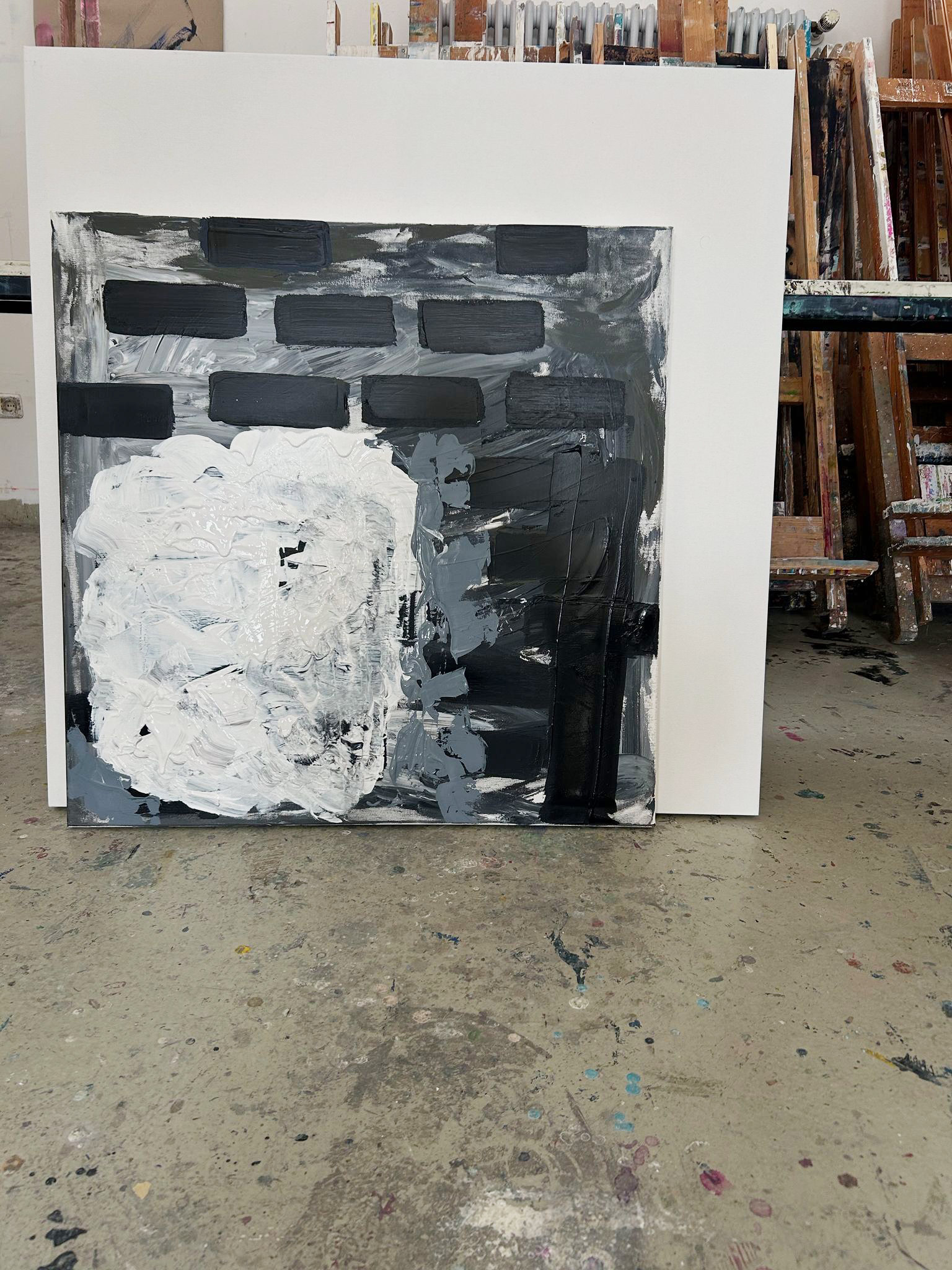 Das Gemälde steht auf dem Boden und ist an eine größere, unbemalte Leinwand angelehnt, was den Eindruck der „Masse“ des Bildes verstärkt.