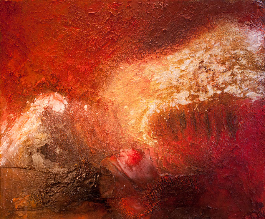 With this work “Australian Fire Landscape”, the artist wants to describe more than just a landscape. It expresses her impressions from a trip to Australia in 2017. The artist has created an image symbolizing the heat, dryness, and red earth as experienced in the Australian Outback. The immediacy of the shimmering heat, the fine, sandy red soil, represents the powerful, almost eruptive energy of the Outback. The dominant red tones also recall the glowing horizon of Australia during the bushfires. Structures made of thickly applied flour mixed with paint create relief-like elements that move across the canvas like flickering flames. Golden and white areas break through the density of the red and suggest sparks, ashes, or glowing fields of embers. Dark areas in the lower part convey a ground left burned and parched. Despite the force and drama of the composition, the artist wanted to let hope resonate. Because light breaks through the scenery — it spreads and stands for renewal and for the resilience of nature, which, despite heat and drought, always finds a way.