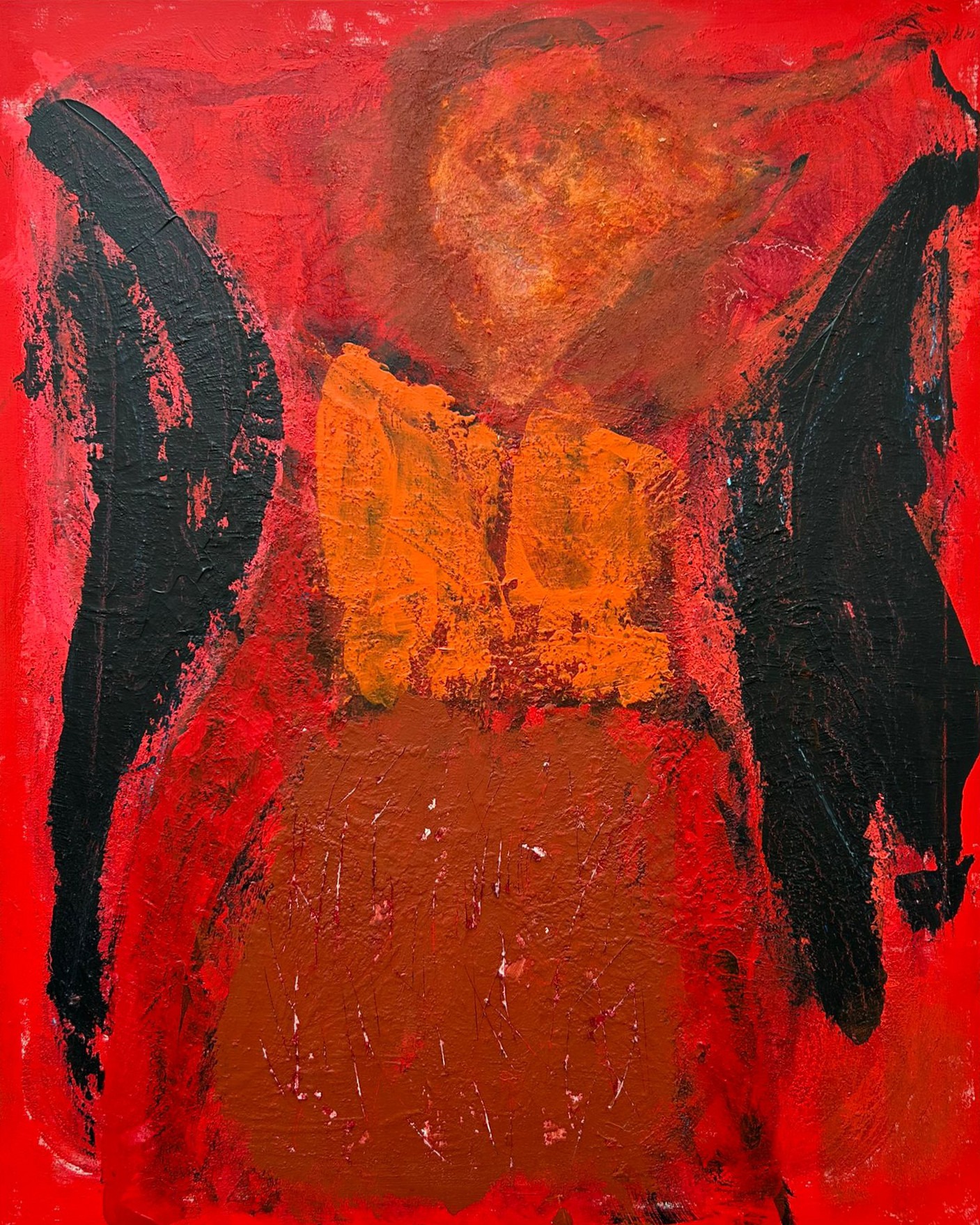 With the painting “Angel over Berlin or the Shamaness”, the artist seeks to convey the tension that arose in Berlin after the fall of the Wall. The figure suggests that something occurred through this event that no one could have imagined. It was a breakthrough guided by an almost magical reality. Therefore, the figure bears the features of a shamaness: earthbound, in warm red tones, with powerful, elemental energy that seems to flow from the depth of the material. The black, expansive shapes resembling angel wings are meant to symbolize protection and comfort. With this dual meaning – shamaness/angel – the artist opens a space of resonance that unites opposites such as history, pain, renewal, creativity, and expectant lightness. The shamaness embodies healing and the archaic, while the angel represents the transcendent, the principle of hope. By combining these two realms of imagery, the artist opens a dimension where human vulnerability and spiritual strength merge, creating a message of transformation and inner protection.