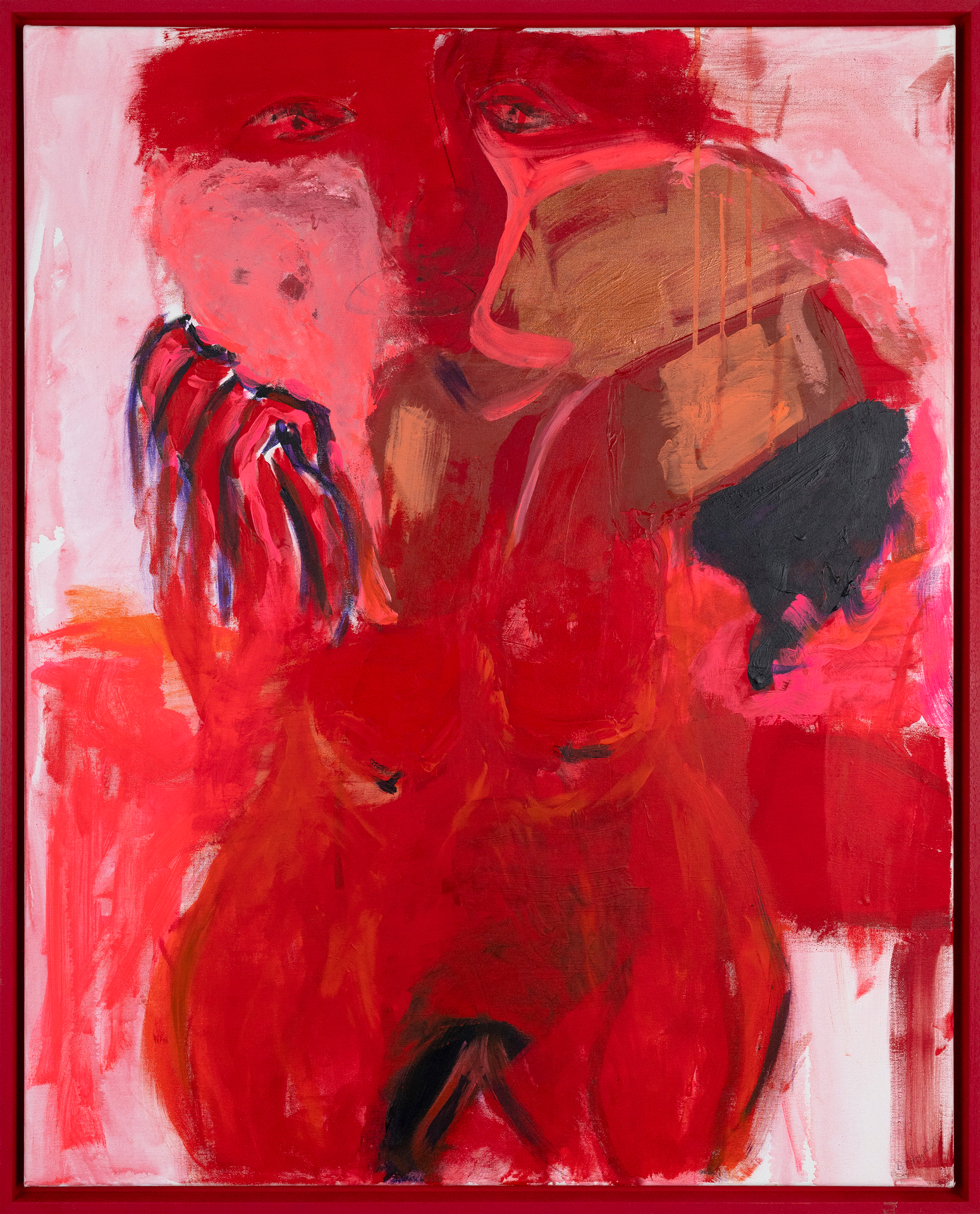 Mit dem Gemälde „Sinnliche Weiblichkeit in Rot“ entfaltet die Künstlerin ein kraftvolles, zugleich verletzliches Porträt weiblicher Präsenz. Es dominieren intensive Rot- und Rosatöne. Sie lassen den Körper mit dem Hintergrund verschmelzen zu einer Einheit aus Wärme, Leidenschaft und Stärke. Die abstrakt angedeuteten Konturen – ein Blick, eine Hand, weiche Rundungen – öffnen Raum für Interpretation zwischen Zartheit und Selbstbewusstsein. Erdige Braun- und Schwarzakzente setzen Kontraste, die das Emotionale vertiefen. Die Künstlerin benutzte eine expressive Malweise mit sichtbaren Pinselspuren um das Unmittelbare, Authentische zu betonen. Es verleiht dem Bild eine körperliche, atmende Energie. Mit diesem Werk feiert die Künstlerin die weibliche Form nicht als Objekt, sondern als kraftvolle Verkörperung von Sinnlichkeit, Intimität und Selbstbestimmung.